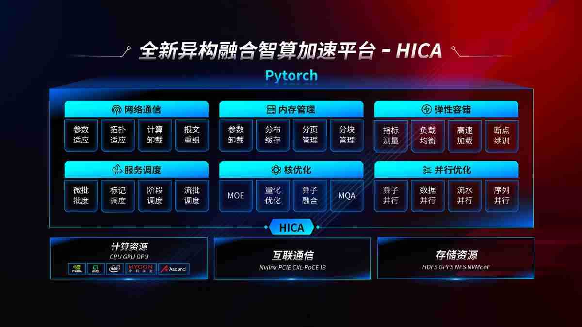 通过自研的服务层、、、中间适配层、、、以及调度编排算法,,,采用数据并行、、、模型并行等多种并行方式,,把并行计算任务进行有效的分解,,,使其分别由相应的软件栈和算力资源来承接。。。当GPU资源变化,,,,HICA可以实时动态调度计算子任务并调整模型拓扑和架构,,,以充分聚合各种算力资源。。。