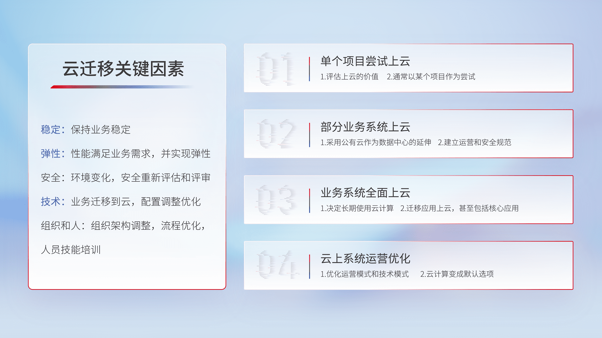 结合实际业务,,,从规划设计、、、、云平台选型、、、云原生改造、、、数据迁移、、集成交付,,,,迁移全过程为客户识别最佳上云路径,,做好风险识别管理,,设计网络架构、、、身份权限、、、、安全审计合规、、操作审计、、、日志审计、、监控告警策略、、、多站点容灾设计等,,,对云上基础设施进行整体规划,,,提升IT治理水平,,,以满足弹性、、、高可用、、、、高性能的需求。。