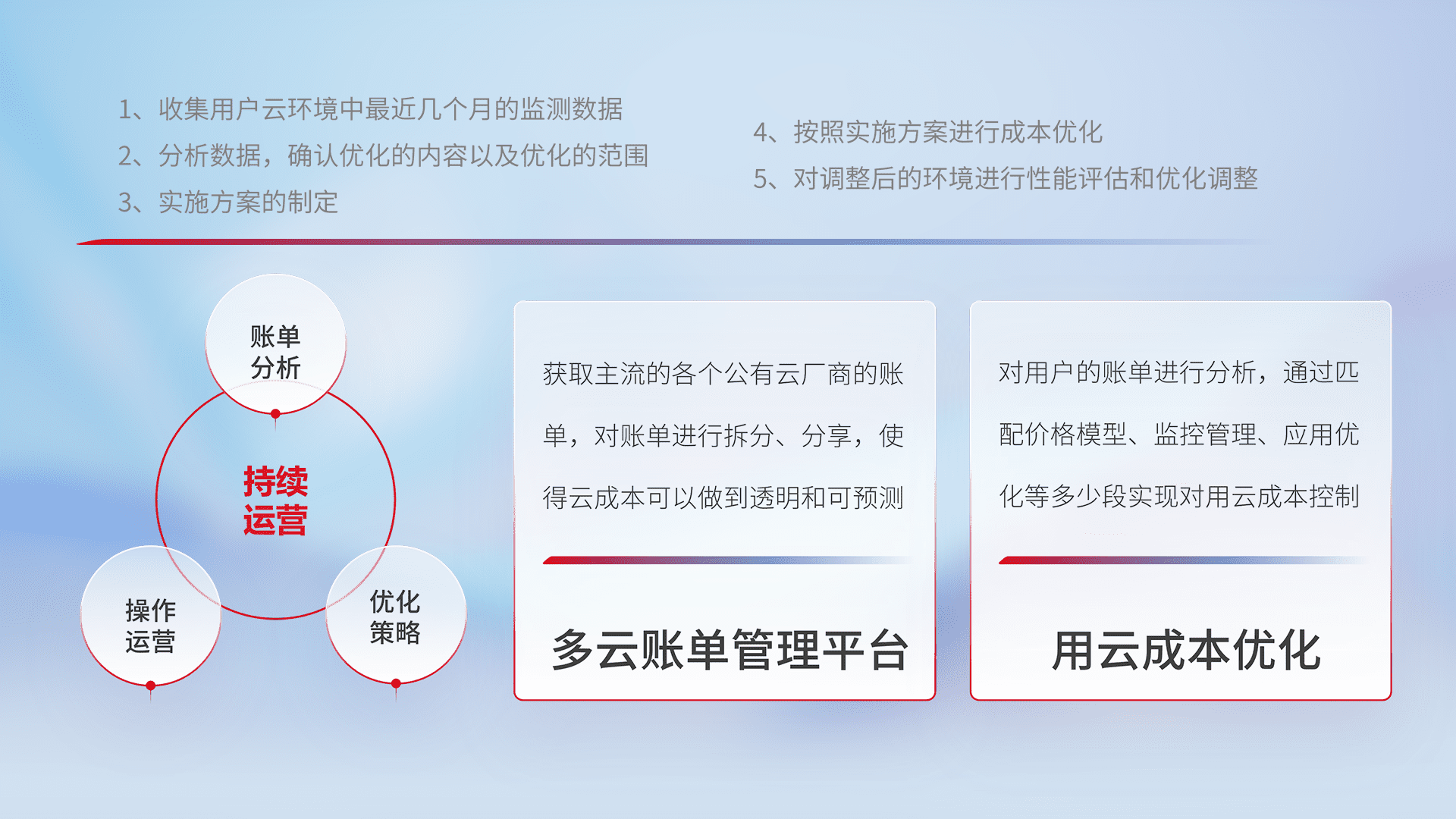 通过多云纳管,,,,以统一的资源数据模型把客户的云资源进行抽象和封装,,,进而实现对多云资源的统一操作,,,,保障云资源管理的可靠性、、稳定性与可用性。。量身定制化运维内容,,,,配置、、开发运维、、、、补丁管理、、、备份、、、、监控、、、、认证和访问管理、、审计和日常巡检等,,保障在用云过程中的可靠度,,,,稳定度以及高可用率。。。